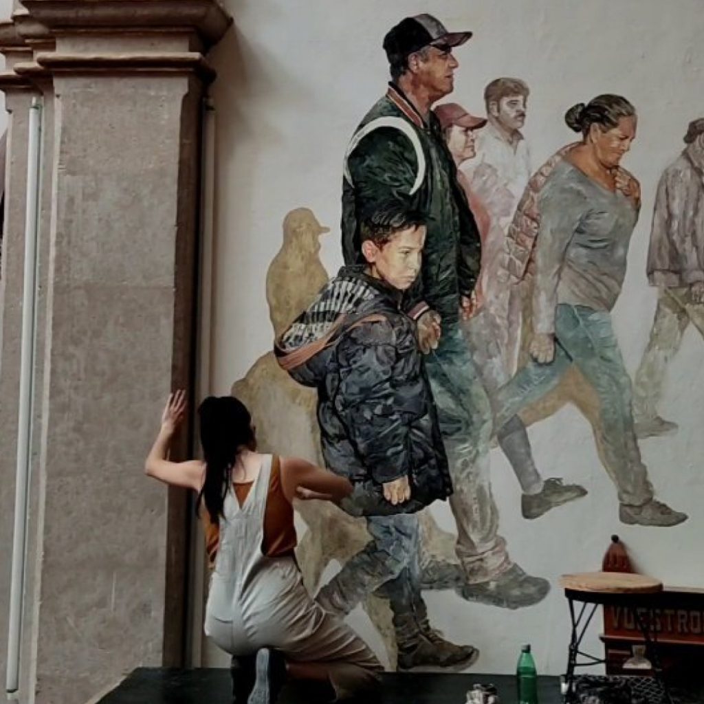 Para el elemento de “Aire” la artista retrató una caravana de Migrantes que aunque al principio fue escandaloso en la capilla, cobró mejor entendimiento por parte de los feligreses cuando justo en el mural de enfrente retrata a la Sagrada Familia en su procesión hacia Egipto cuando tuvieron que huir.